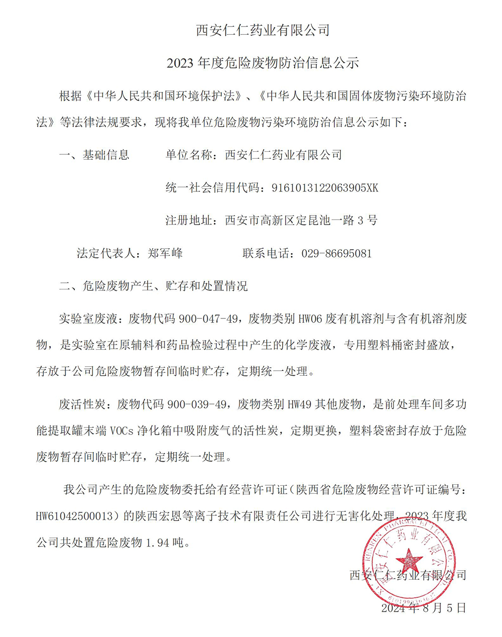 2023年度危險廢物防治信息公示